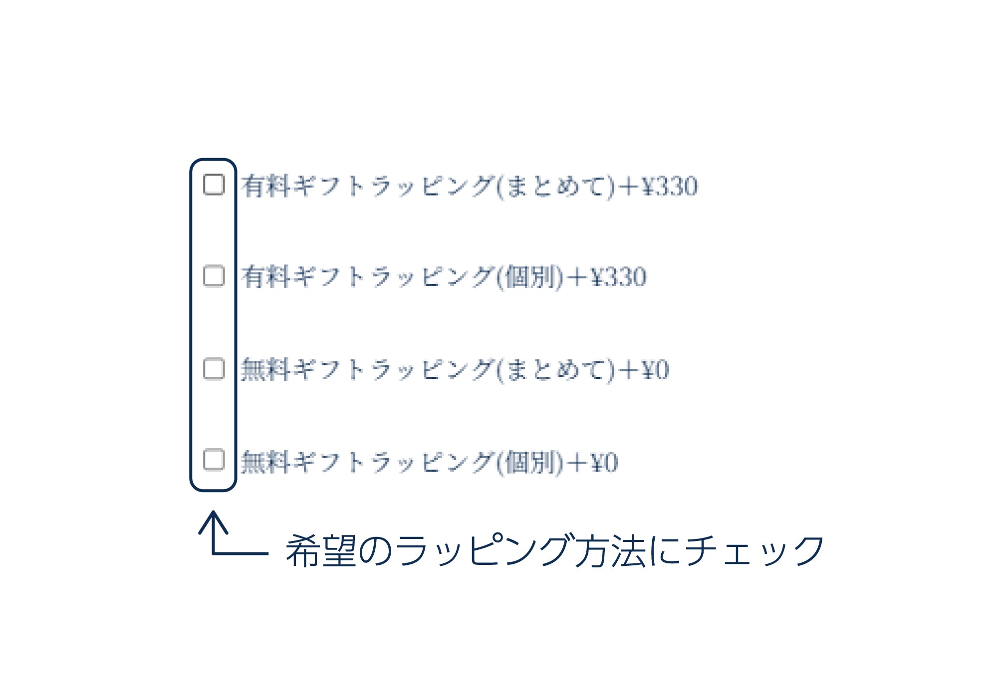 If you would like gift wrapping, please select "Combined wrapping" or "Individual wrapping" from the checkboxes on the cart screen.